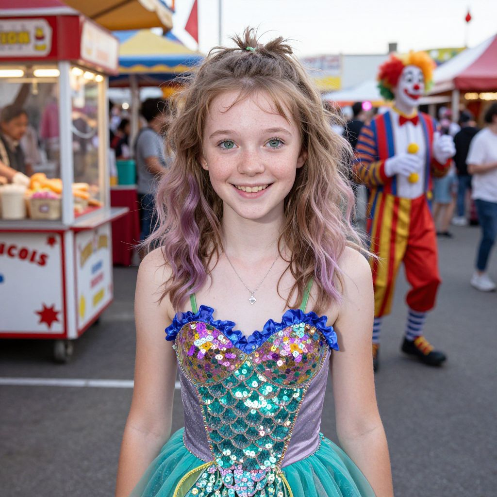 A candid, realistic photo of a cheerful teenage girl with freckles, bright green eyes, and messy pastel hair, embodying a 'costume hopper stranger' — she’s wearing a colorful carnival-themed costume of a dancing mermaid with glittery fins and a sequined dress, standing in a lively carnival midway with popcorn stands and clowns in the background.