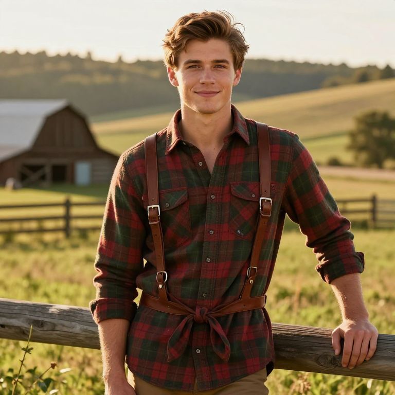 A young male with short brown hair stands confidently in a sunlit outdoor setting, wearing a classic plaid shirt in earthy tones—deep red and green—tied at the waist with a brown leather strap that rests over his shoulders, giving a casual yet stylish look. He has a warm, approachable expression, with a slight smile, and is slightly turned toward the camera, one hand resting on a wooden fence. The background features a rural landscape with rolling hills, a wooden barn in the distance, and soft golden-hour lighting that enhances the texture of the fabric and the natural surroundings.