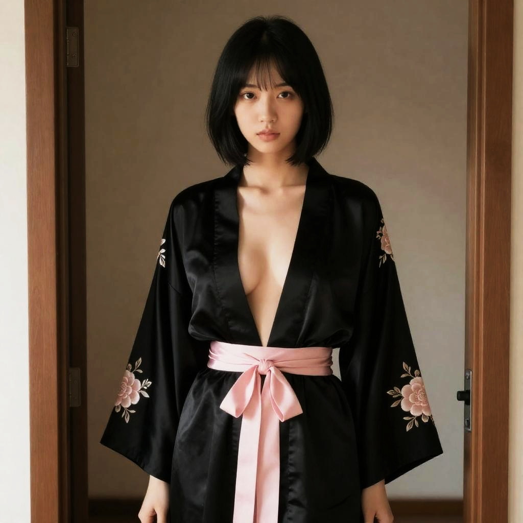 Woman with short black hair, wearing a black silk robe with pink floral embroidery and a pink sash, stands in a doorway. Her robe is open, exposing her small breasts. She has a neutral expression. Soft, warm lighting in the background. Another person's arm is partially visible on the right.