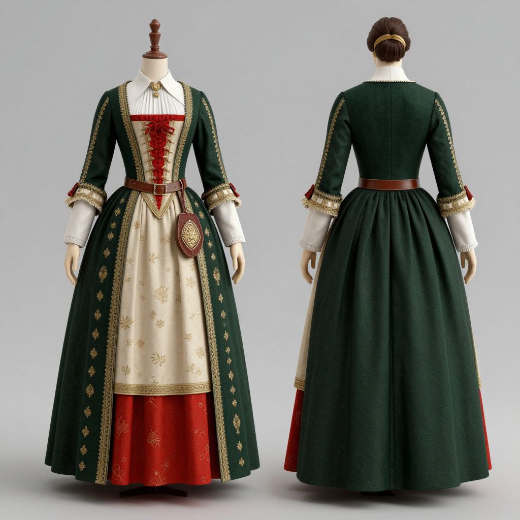 A high-definition 3D-rendered depiction of a Georgian-era woman's full outfit, showcasing intricate details in her layered dress with a combination of dark green, cream, and red hues, complemented by gold embroidery and a brown belt with a decorative pouch, presented in both front and back views to highlight the historical fashion and craftsmanship.