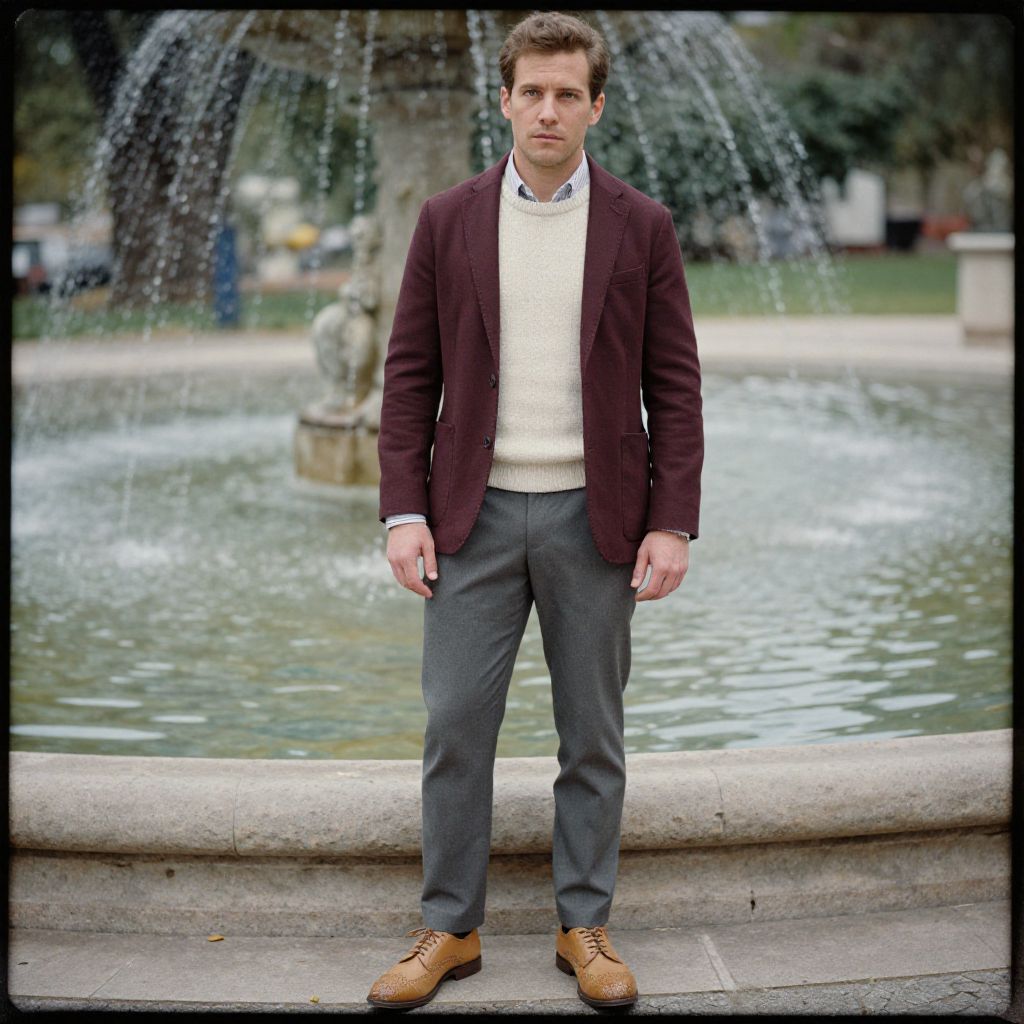 A man, burgundy casual blazer, cream knit sweater, slate gray dress pants, tan brogues, standing by a peaceful fountain, calotype process, contemplative expression Man has masculine face and piercing eyes