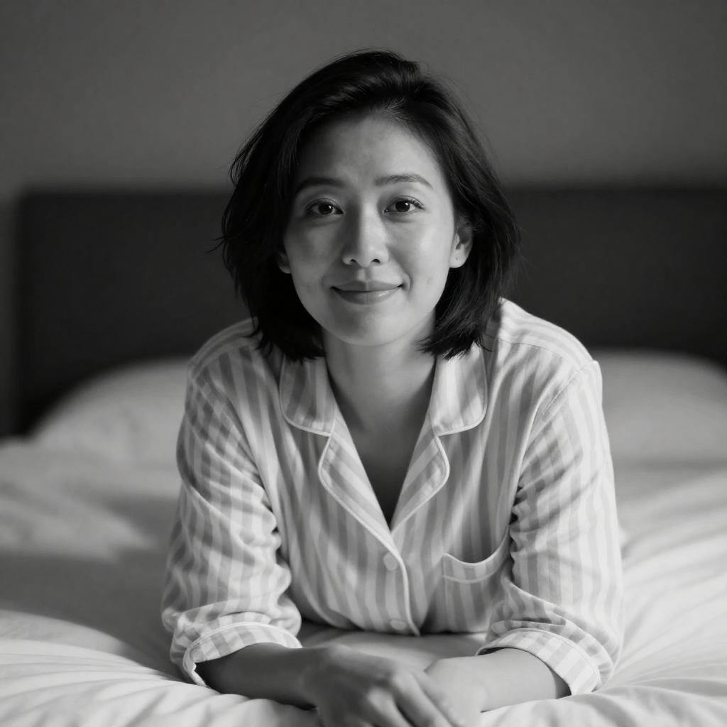 Black-and-white photograph of a woman with a short, straight, dark bob haircut, bangs, and large, expressive eyes. She has a slight smile, light skin, and wears a light-colored top. Background is a plain wall. She looks slightly to the left. Textured hair and soft lighting. Upper body portrait.