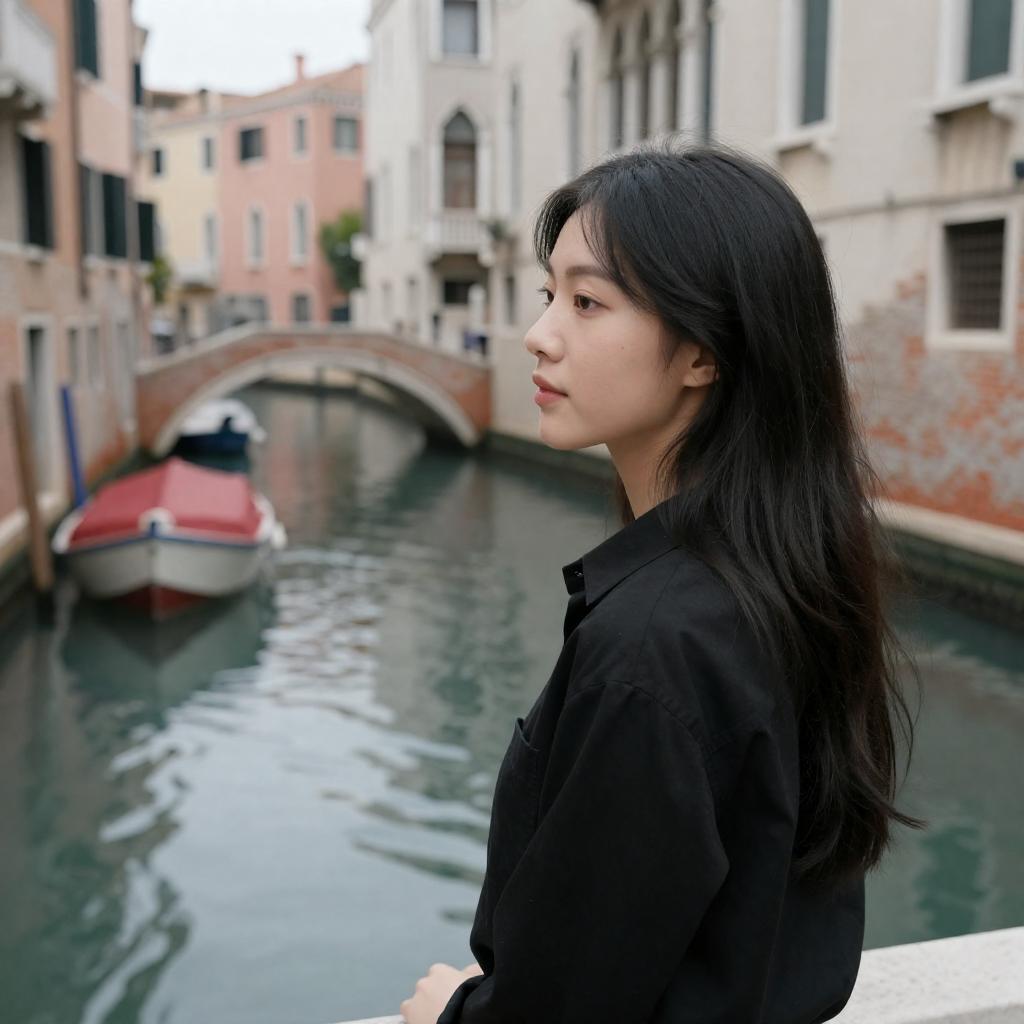 Young Asian woman with long black hair, wearing a black shirt, standing in profile on a canal in Venice. Background: arched stone bridge, red-covered boat, boats moored along canal, brick buildings. Ripples in canal, overcast light.