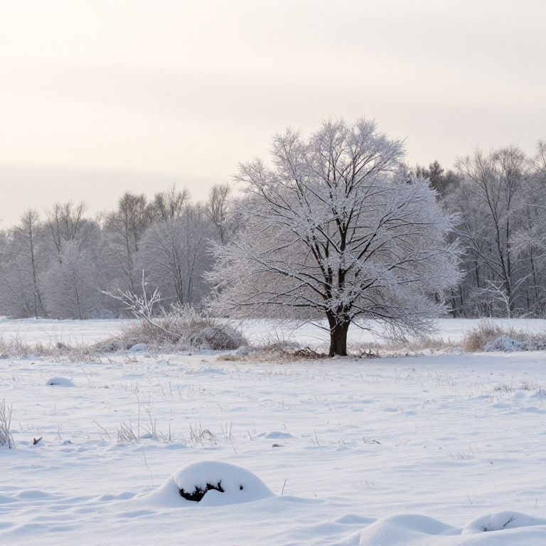 Photograph of a snow-covered field with a lone, frost-coated tree centered, surrounded by snow-draped bushes and trees in the background.