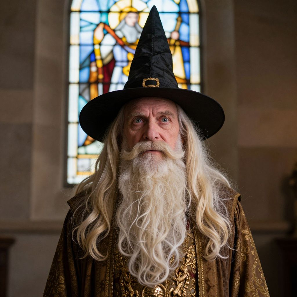 Old wizard costume, beard, 1boy, solo, male focus, facial hair, hat, wizard, long hair, old, old man, wizard hat, witch hat, stained glass, mustache, upper body, indoors, blonde hair, long sleeves, white hair