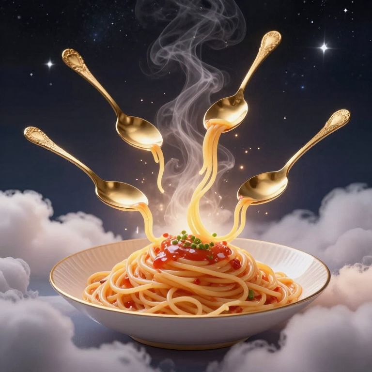 Four golden spoons hover above a swirling cosmic bowl of spaghetti, emitting radiant steam against a starry night sky, encircled by fluffy clouds and bathed in ethereal light.