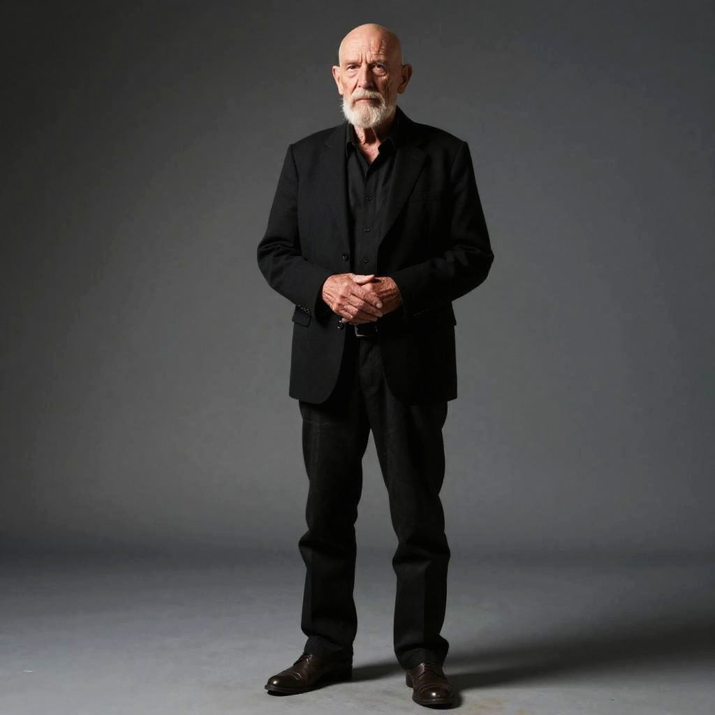Old, male focus, bald, 1boy, old man, facial hair, grey background, solo, wrinkled skin, shirt, reflection, jacket, gradient background, pants, beard, collared shirt, realistic, standing, black shirt, simple background, closed mouth, own hands together, cowboy shot, shadow, mustache