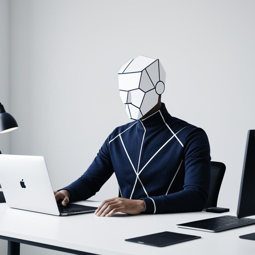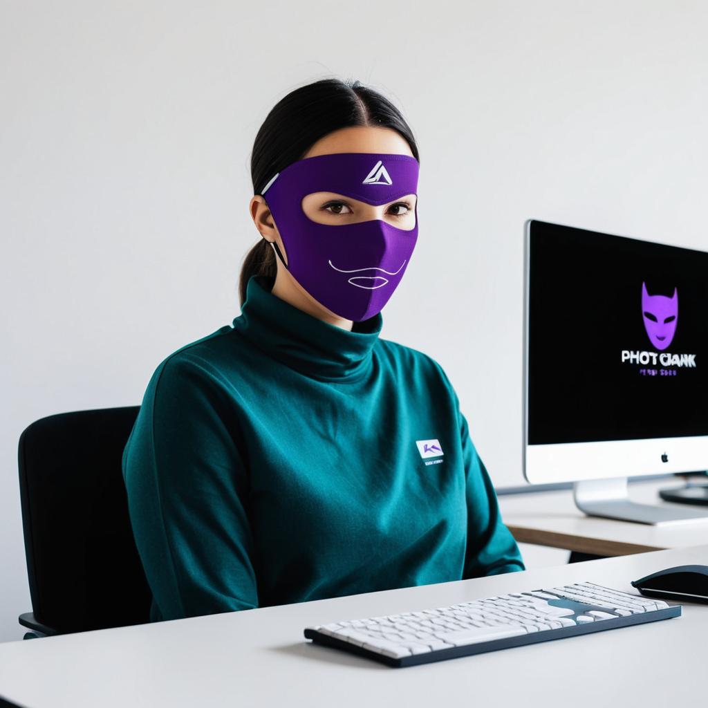 4K: Design a minimalistic and modern logo featuring a clean, gender-neutral butterfly with no facial hair, sitting at a desk with a computer. The figure is depicted using linear minimalism. Use a bright palette with shades of purple and silver representing technology and professionalism.