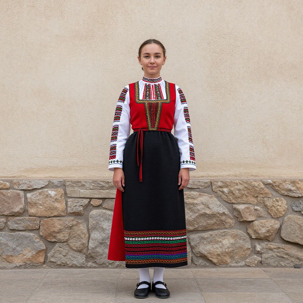 Photograph of a young woman with light brown hair in a traditional Bulgarian outfit: white long-sleeve blouse, red bodice, black skirt,