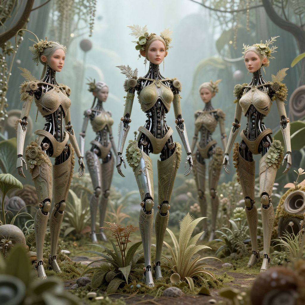 A group of intricately detailed, biomechanical woman robots with botanical elements, resembling cyber dryads in a virtual reality garden.