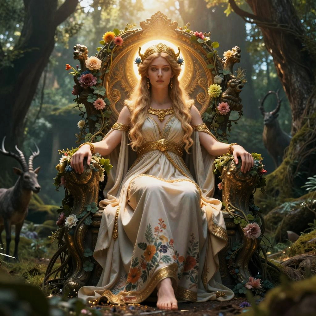 A fantasy interpretation of Cybele, the primordial goddess, sitting on a throne of vines and flowers, radiant with soft golden light, wearing flowing robes with floral patterns, set in an ancient forest with mythical animals, highly detailed, ethereal ambiance