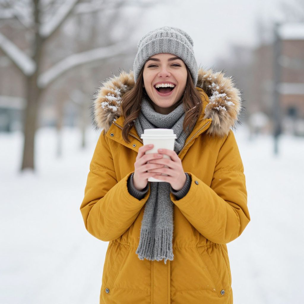 Photograph of a smiling young woman in a yellow winter coat with fur hood, gray knit hat, and scarf, holding a coffee cup in a snowy
