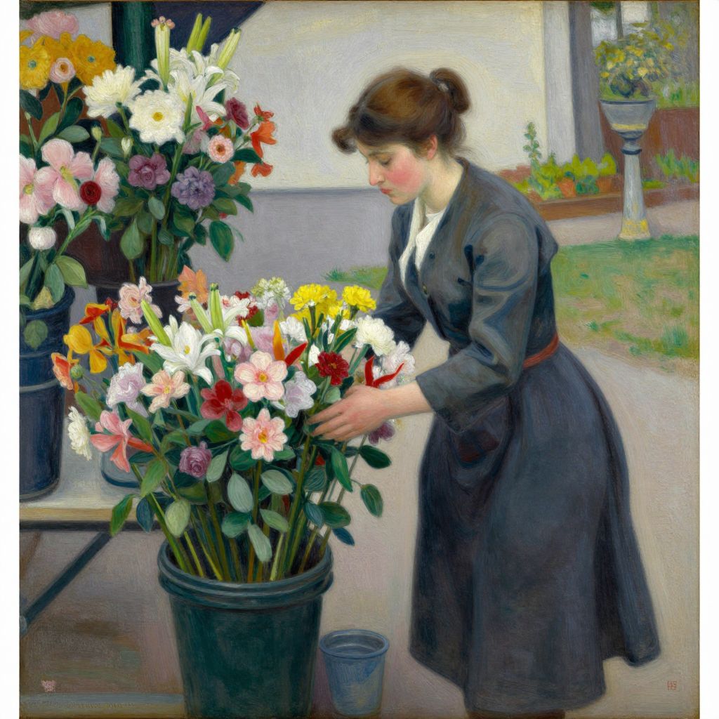 Impressionist painting of a woman in a dark dress arranging colorful flowers in pots, with a garden and urn in the background.