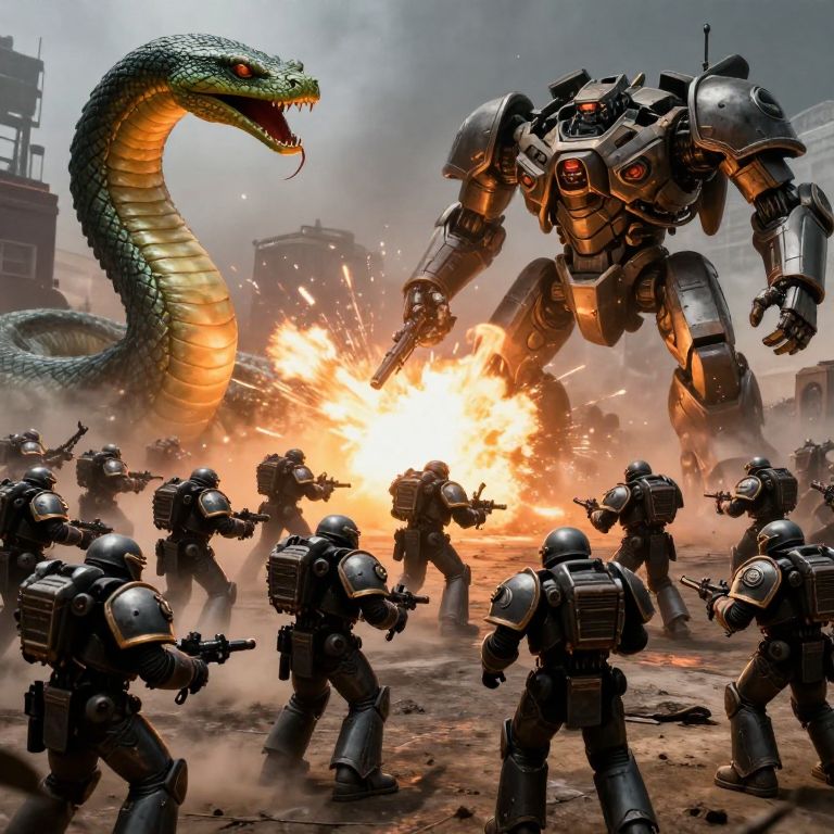 Photorealistic digital artwork depicting a chaotic battle scene. In the foreground, a group of heavily armored soldiers in dark, metallic suits with rifles are firing at a massive, robotic warrior with glowing red eyes and intricate armor. The robot, positioned to the right, is engulfed in an intense explosion, creating bright orange flames and billowing smoke. To the left, a large, green, scaled snake with a menacing open mouth and sharp fangs looms, adding to the danger. The background features a cityscape with partially visible, damaged buildings under a gray, smoke-filled sky. The scene is dynamic and intense.