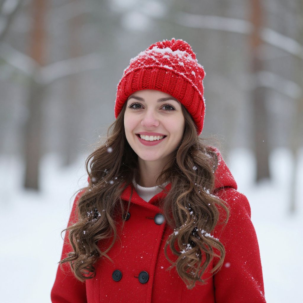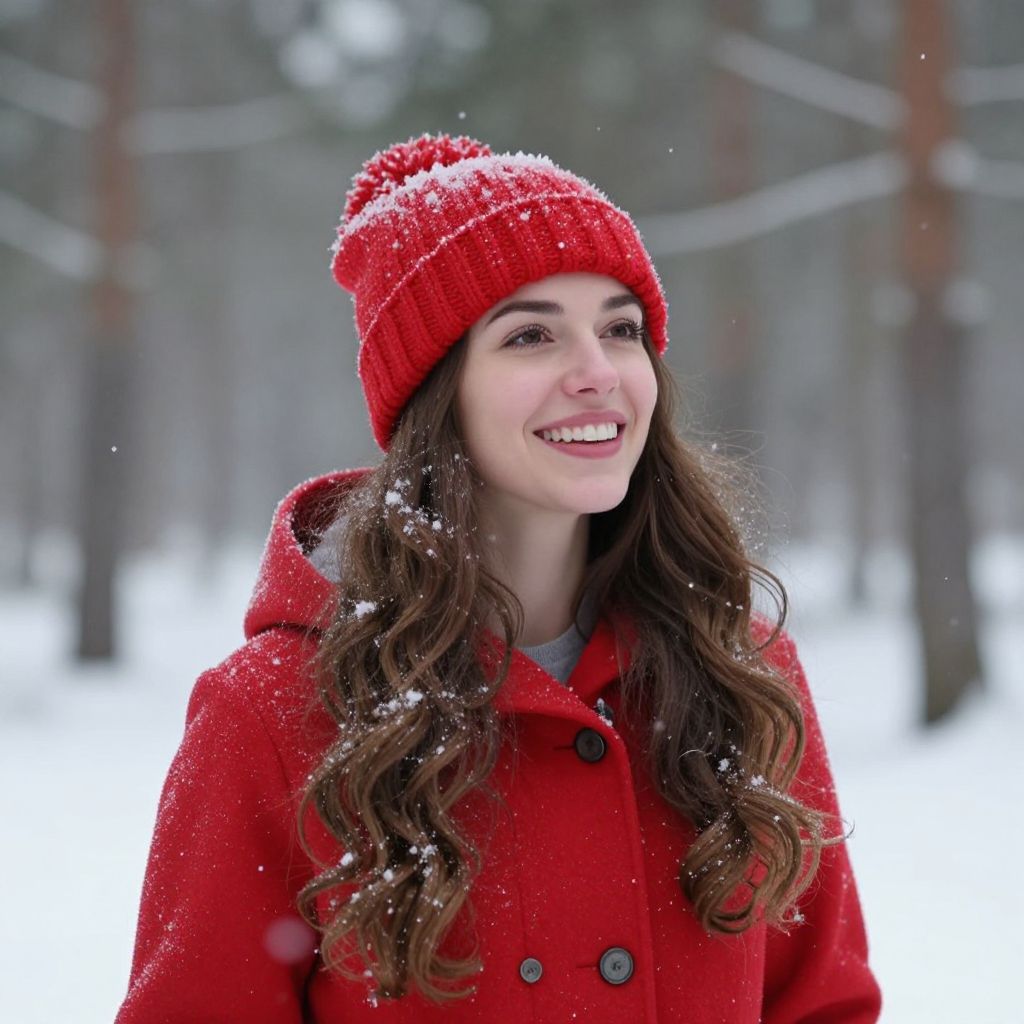 Woman wearing a vibrant red knitted hat and coat stands joyfully amidst falling snowflakes, her long wavy hair cascading over her shoulders in a serene winter forest setting.