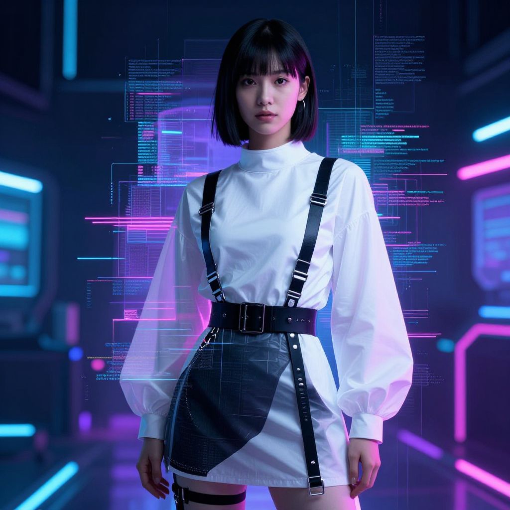 Pixprompt girl standing in a futuristic cyberpunk city, neon lights reflecting off wet streets, wearing a sleek silver jacket and glowing cybernetic accessories, vibrant color palette with deep purples and electric blues, cinematic lighting, detailed textures, high resolution.