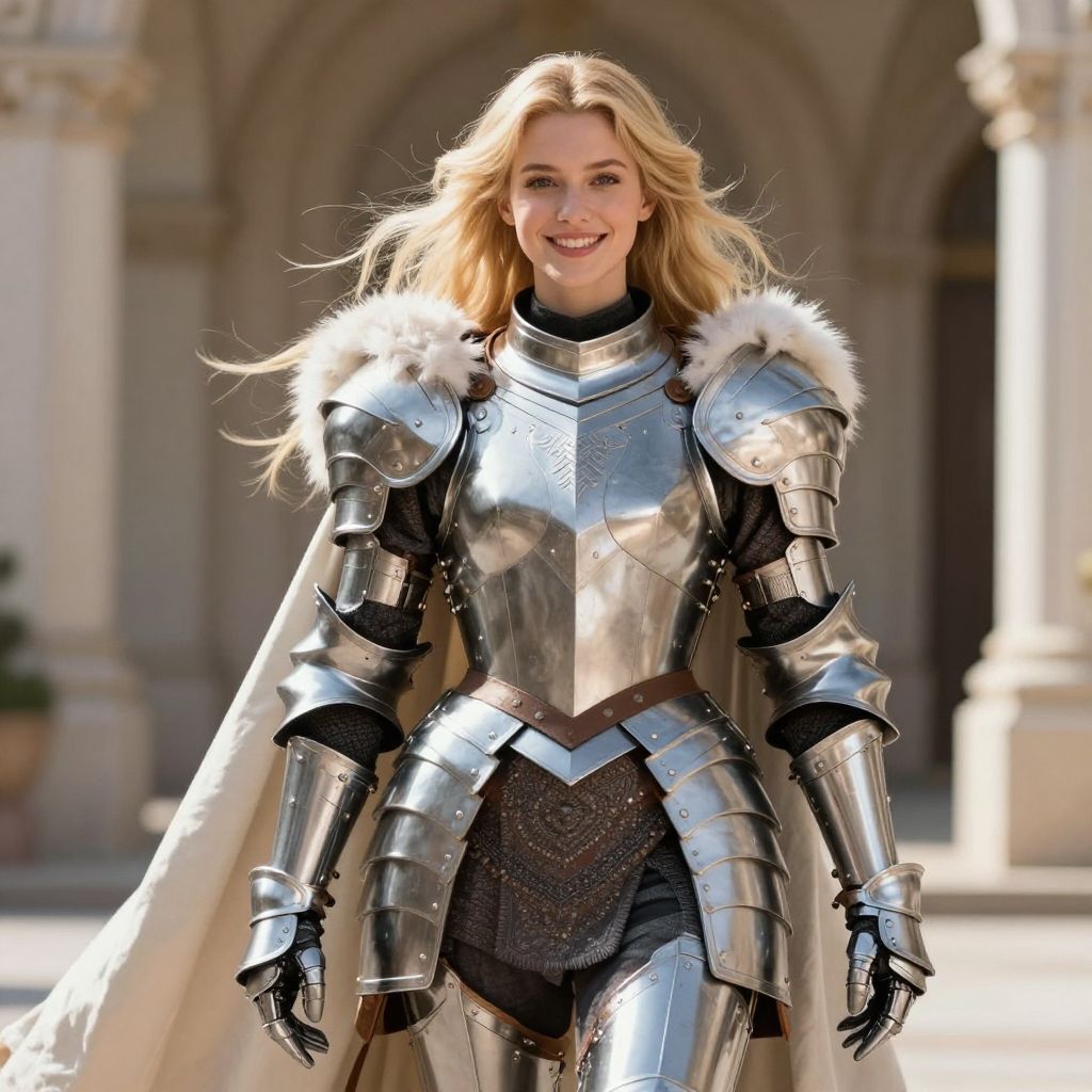 Photorealistic image of a blonde, blue-eyed woman in silver armor adorned with pink roses, holding a sword and floral shield, standing in a snowy