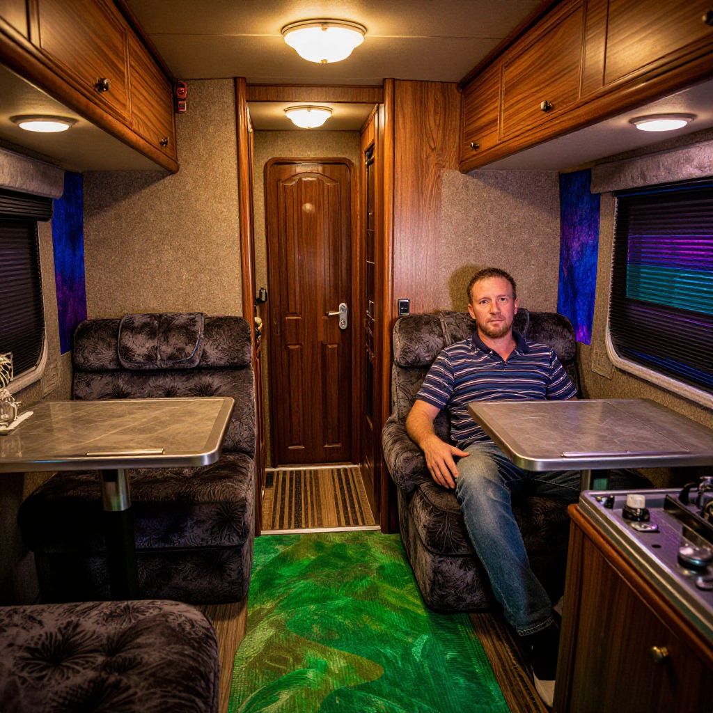 Photograph of a man in a striped shirt, sitting in a cozy, wooden-paneled RV with black upholstered seats and green carpet.