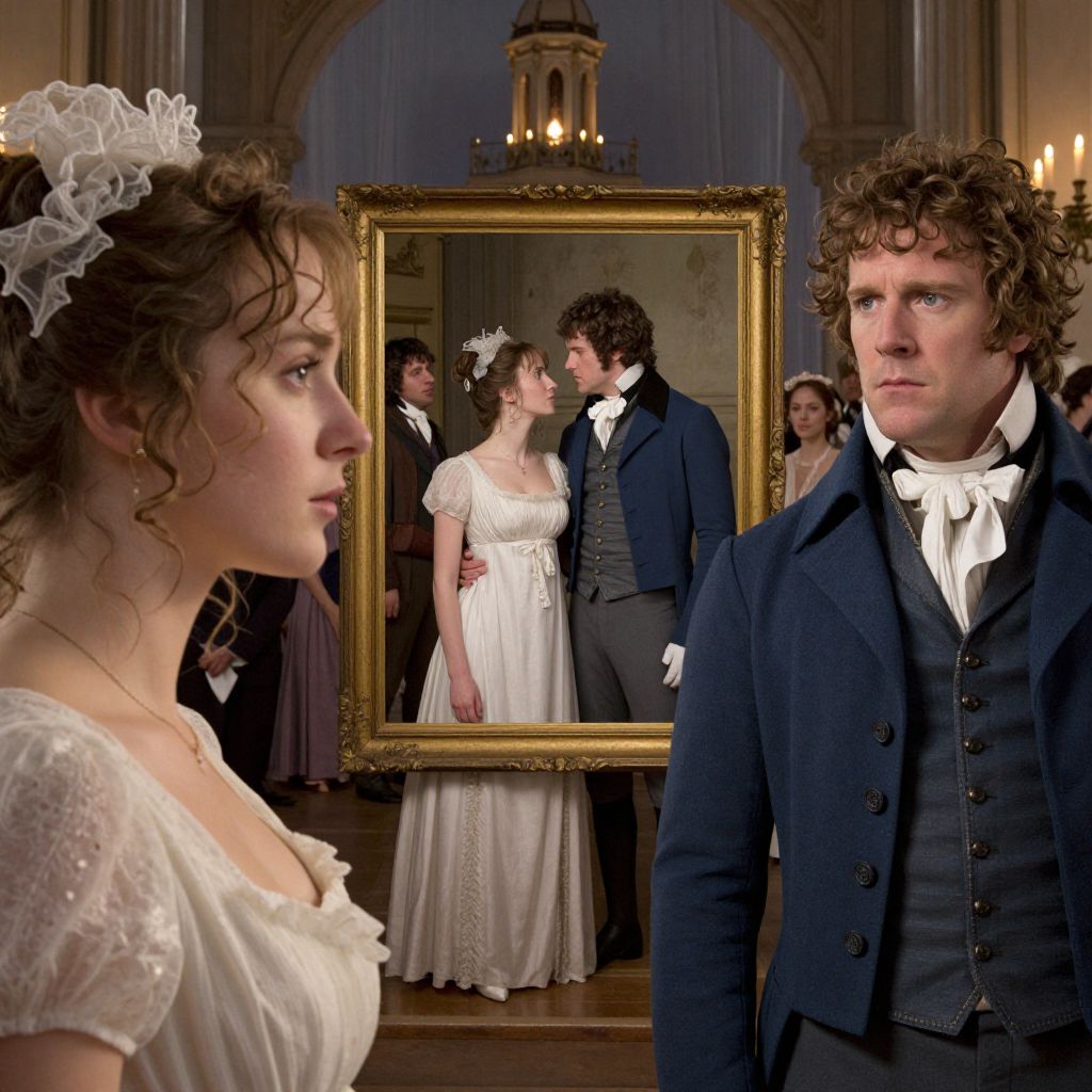 Photograph-style CGI image of Victorian-era couple in wedding attire, reflected in ornate gold frame, with curly-haired man in dark suit foreground, and