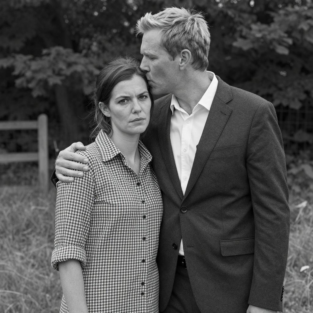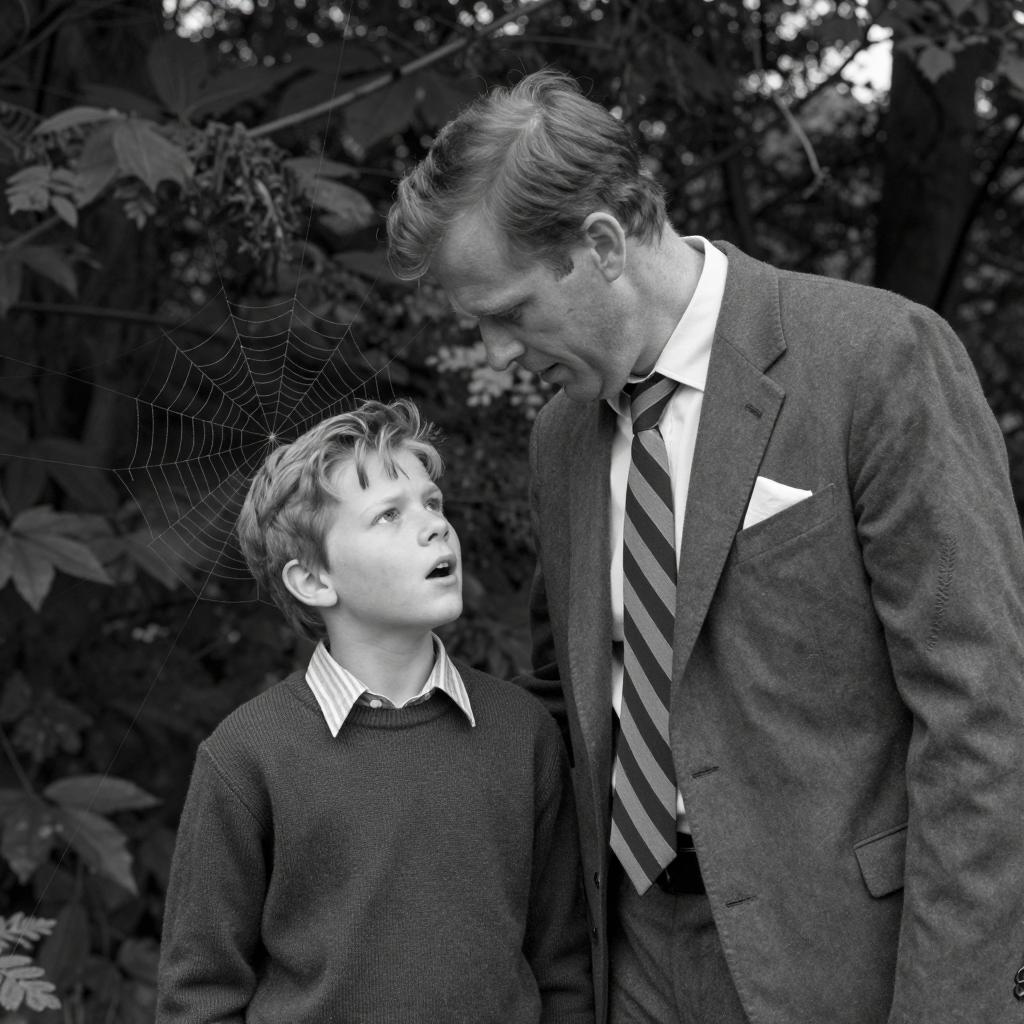 Black and white photograph of a man and boy standing in a forest. Man in suit with striped tie, white handkerchief in breast pocket, leaning over boy. Boy in sweater and collared shirt, looking surprised. Spider web between them. Dense foliage background. Man's face intense, boy's face clearly surprised.