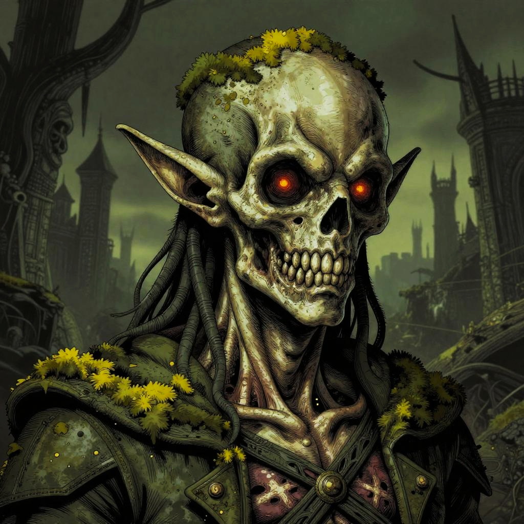 Detailed digital illustration of a male elf-zombie with decaying skin, glowing red eyes, and moss-covered tattered armor, set against a dark necropolis with gothic towers. The character features pointed ears, skeletal facial structure, and long dreadlock-like hair, rendered with fine lines and complex lighting in a horror-fantasy style.