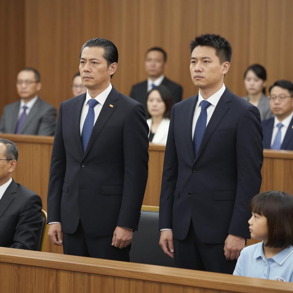 Portrait of two Asian business professionals wearing gray suits and white shirts seated closely at a table during a formal meeting or conference. The man on the left has short dark hair and a serious expression, looking to his left. The man on the right has slightly longer dark hair and is focused on examining a small object in his hands. Background features blurred figures of other attendees, including a woman, in a dimly lit conference room setting.