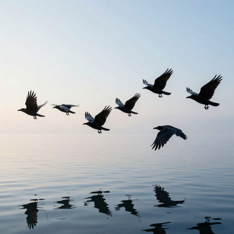 Silhouetted against a serene, ethereal sky, a flock of glass-winged ravens gracefully soars over a tranquil water surface, their reflections mirroring the poetic dance of light and shadow in this digital artwork.
