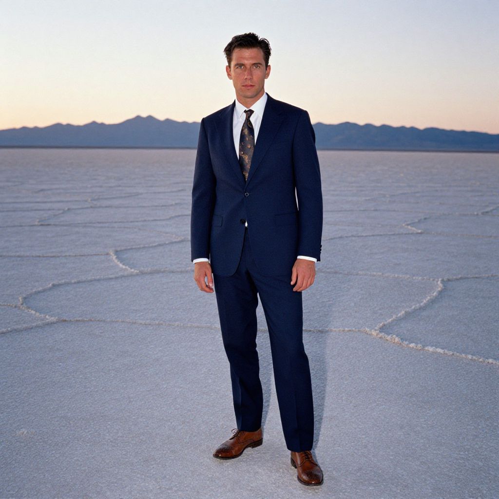 A man, navy blue suit, lightweight wool, white dress shirt, patterned silk tie, brown leather brogues, vast salt flats, cracked earth patterns, distant mountains silhouetted at sunset, AgfaColor film, confident expression Man has masculine face and piercing eyes