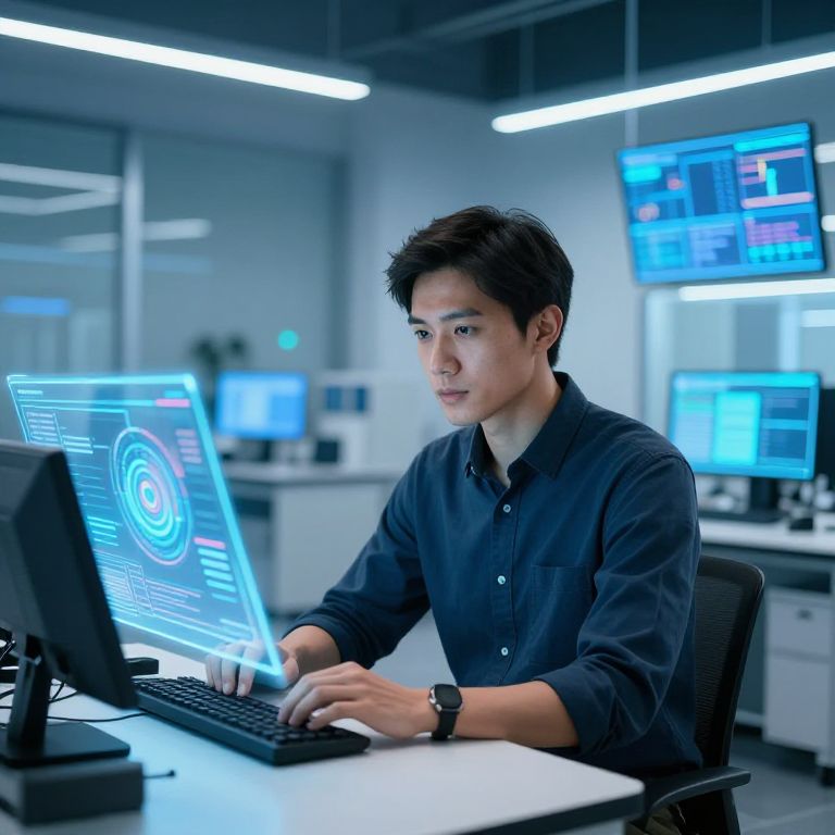 A photograph of a young Asian man with short black hair, wearing a dark blue button-up shirt, seated at a white desk in a modern, brightly lit office. He is typing on a black keyboard while looking at a laptop screen displaying a glowing blue and white spiral pattern. The background features multiple computer monitors with blue and white screens, and overhead fluorescent lights. The room has a sleek, professional atmosphere with white and grey walls. The man's expression is focused and calm.
