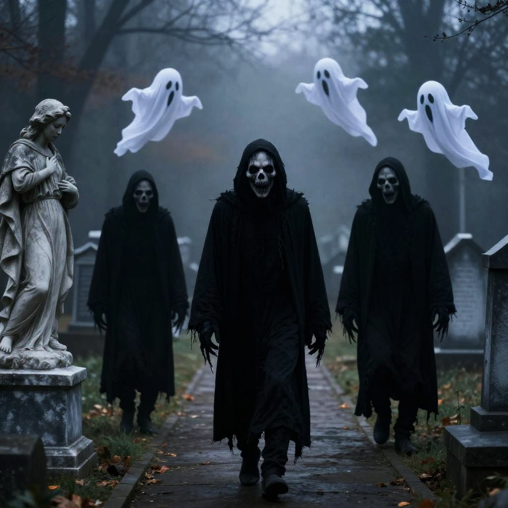 Realistic photo.Three ghouls with scary faces on a misty cemetery path with old statues. Set at nighttime with a playful Halloween atmosphere as ghosts are frightened by the ghouls. realistic photo