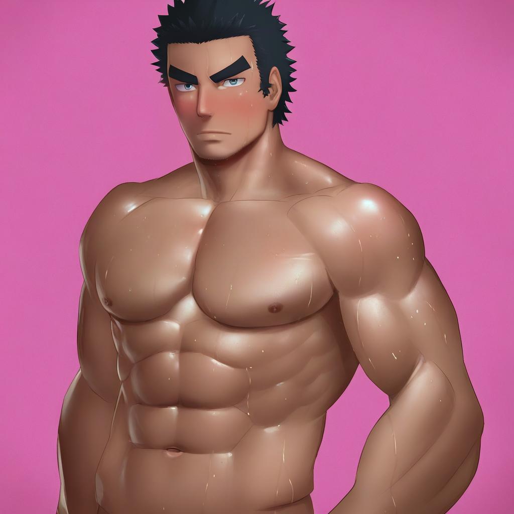 Digital illustration of a muscular dark-skinned anime male character with thick black hair, thick eyebrows, large pectorals, visible abs, and sweating. The character has a serious expression and short spiky hair, depicted in a style influenced by artist Ikeda Kazumi.