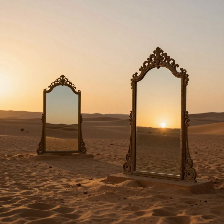 In the quiet expanse of the desert, two ornate mirrors stand as silent sentinels, their reflective surfaces mirroring not just the barren landscape, but the echoes of forgotten dreams and the whispers of lost souls, casting a haunting glow of solitude and introspection under the golden embrace of the setting sun.