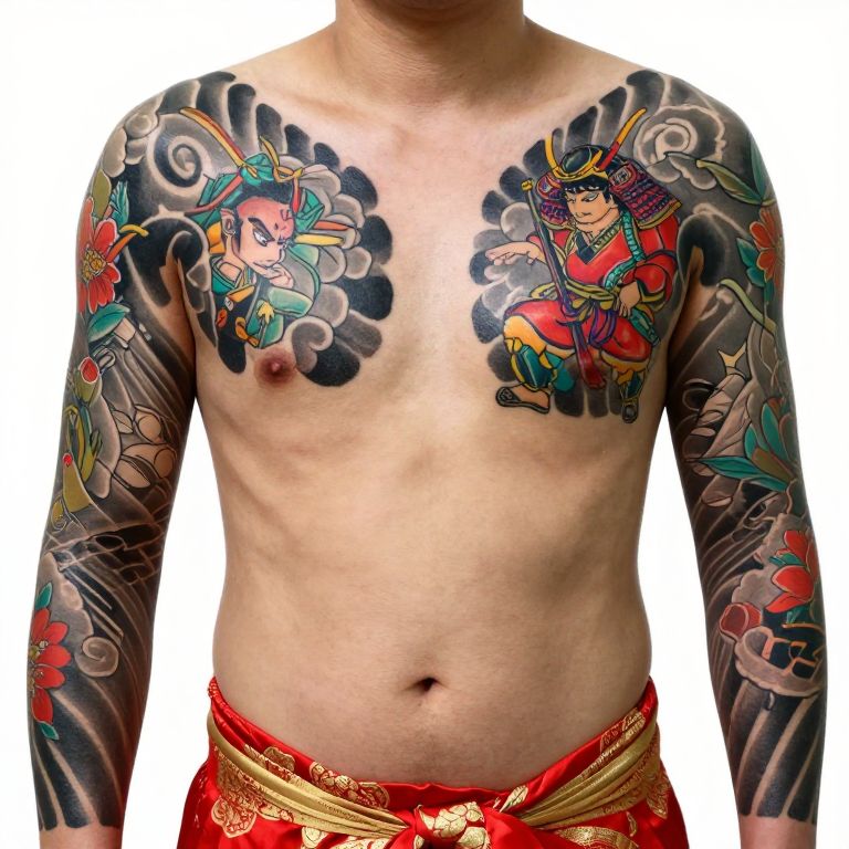 Photograph of two Asian men standing side-by-side against a white, shoji-style screen background. The man on the left is shirtless, showcasing extensive colorful tattoos on his chest, arms, and abdomen, wearing only white boxer briefs. The man on the right is wearing a long-sleeve, full-body tattoo shirt with intricate floral and bird designs, paired with black pants. Both men have short black hair and light to medium skin tones. The tattoos are vibrant, featuring red flowers, green leaves, and colorful birds, creating a striking contrast with their skin. The overall composition highlights the differences between the men's tattoo styles and attire.
