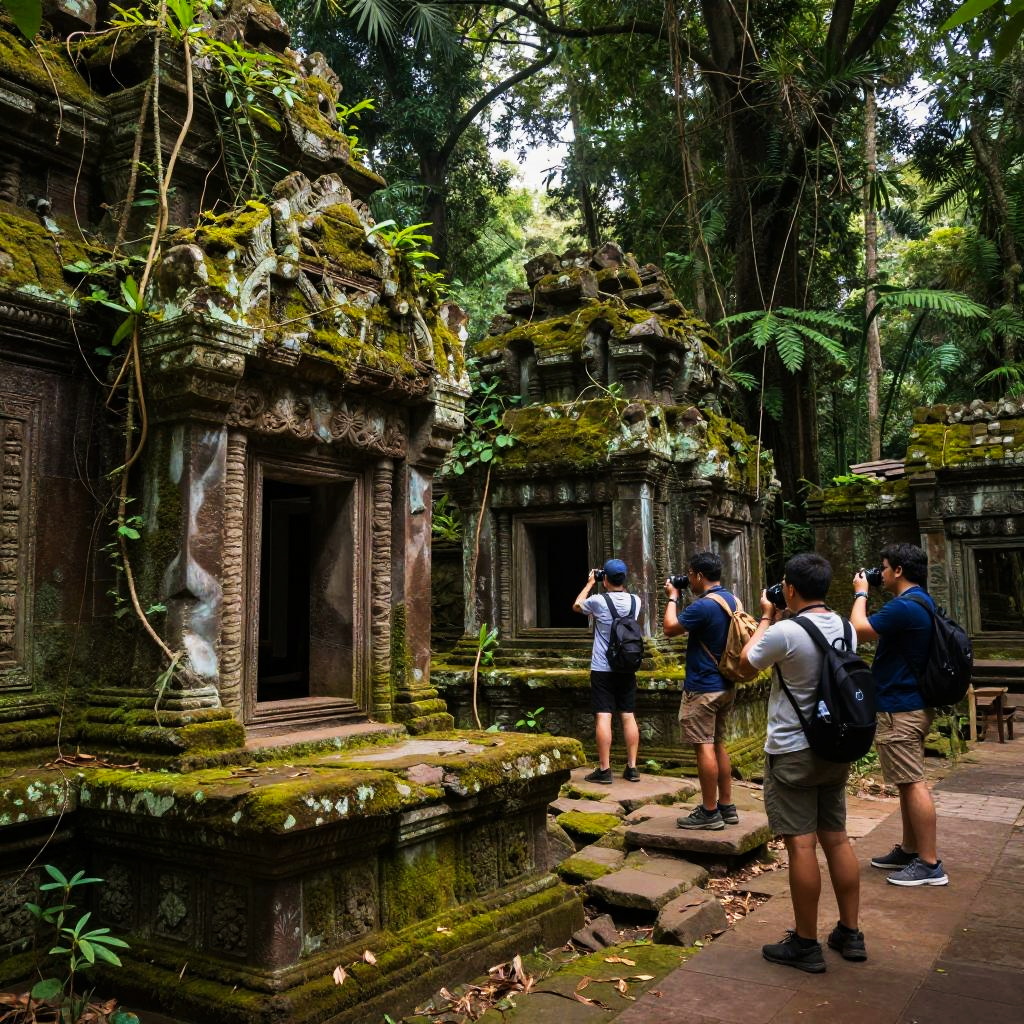 Excursion exploring ancient ruins in a dense jungle, partially overgrown stone structures covered in moss and vines, explorers taking photographs with cameras, dappled sunlight breaking through thick canopy, mystical and realistic style with intricate detail.