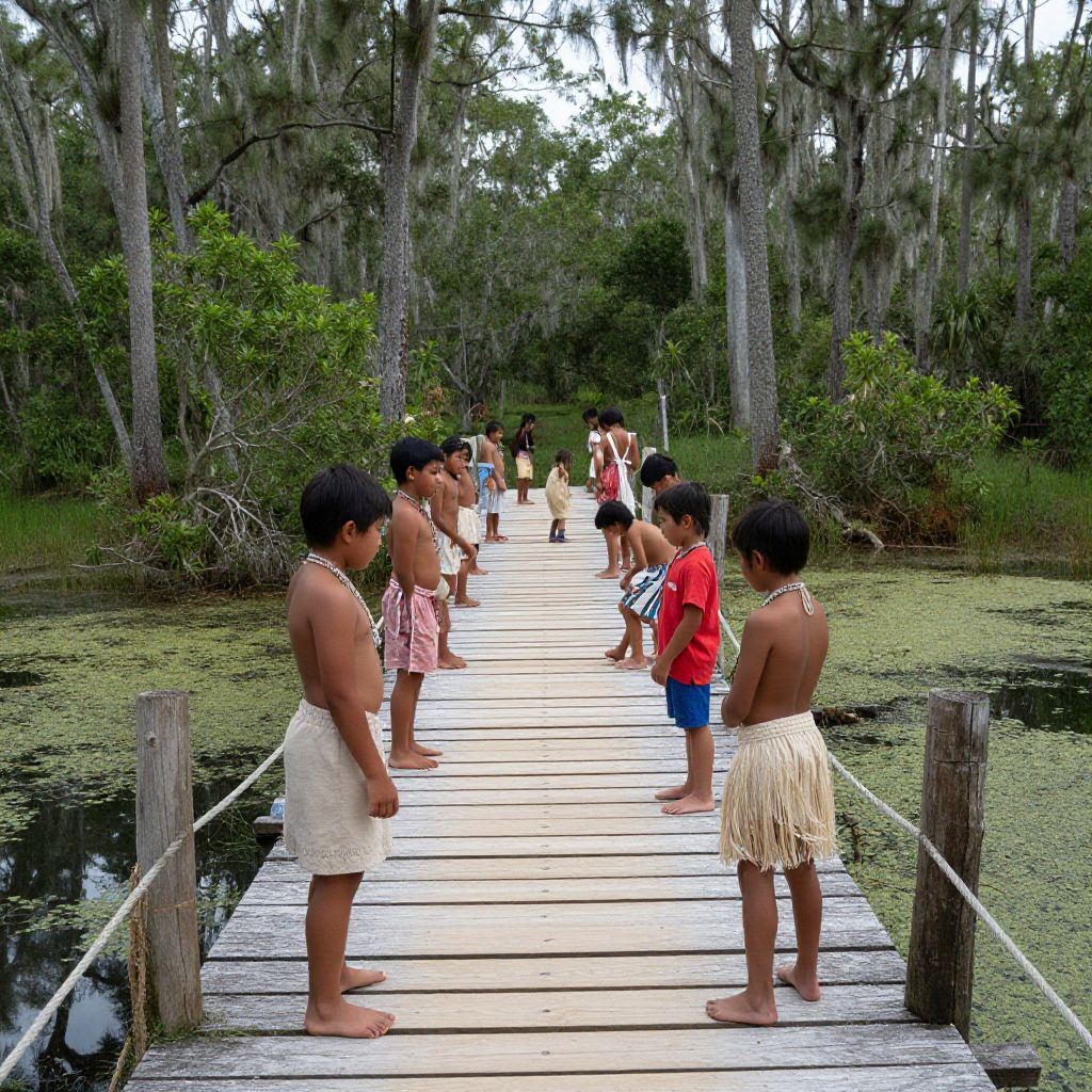 Photograph of Indigenous children in grass skirts standing on a wooden boardwalk in a lush, swampy forest, with trees draped in Spanish moss in the