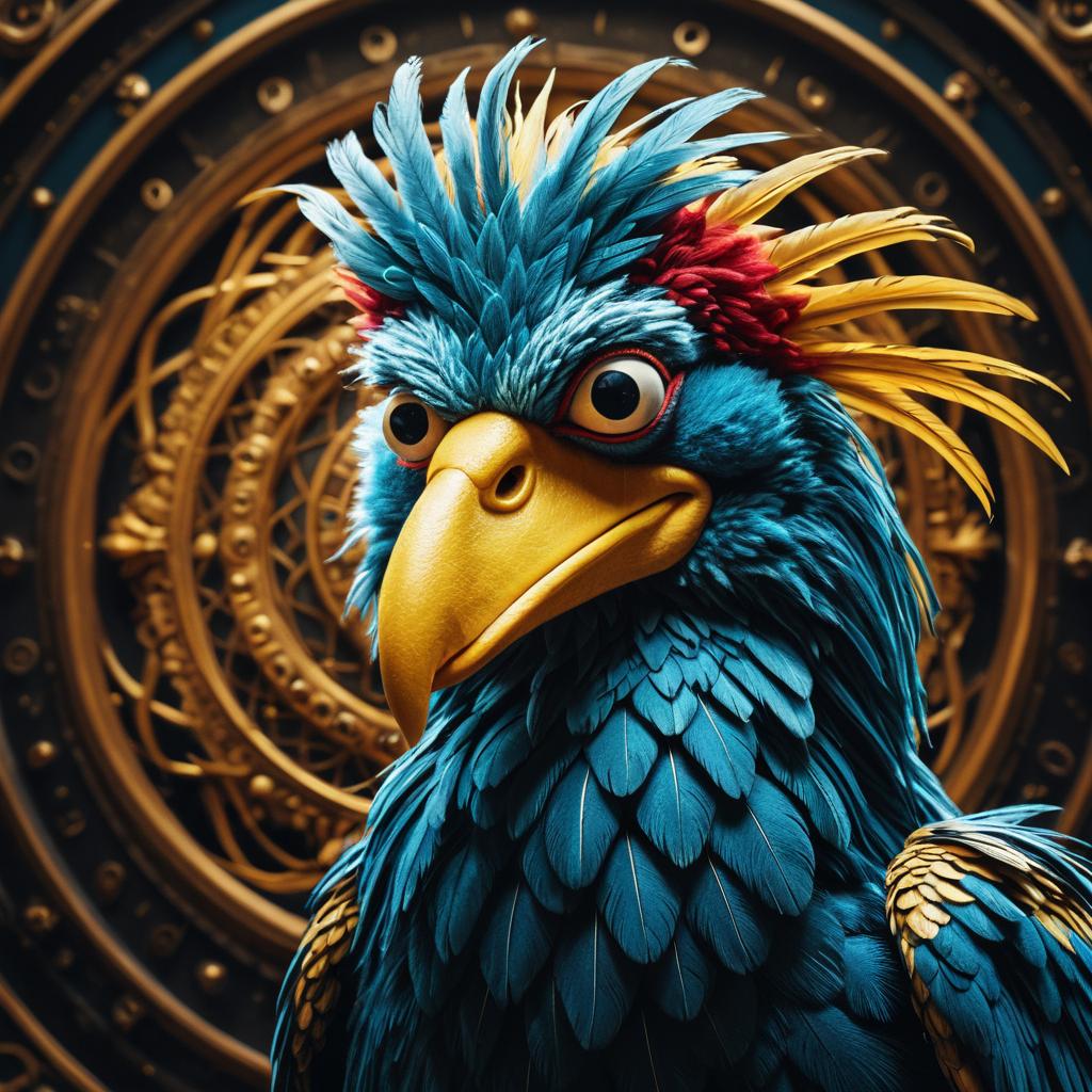 Photorealistic and surreal muppet of a phoenix bird featuring vibrant blue, yellow, and red feathers with intricate textures and large expressive eyes. The image is inspired by Salvador Dalí and showcases psychedelic and highly detailed elements with a dark, ornate circular background incorporating clock and zodiac motifs.