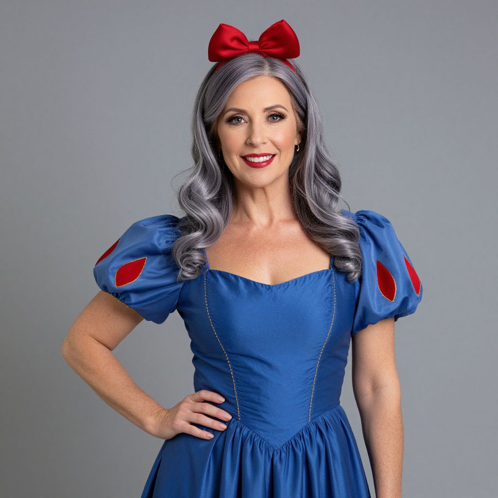 Photograph of a smiling woman with long, wavy silver hair, wearing a blue Snow White costume with red accents and a red bow, standing against