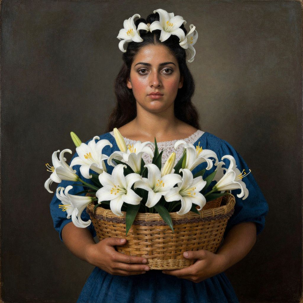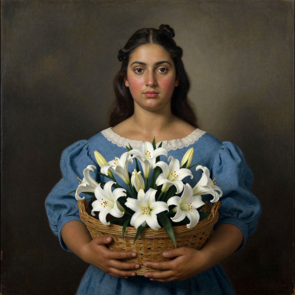 Photorealistic painting of a young woman with dark hair, wearing a blue dress, holding a wicker basket of white lilies. Dark background.