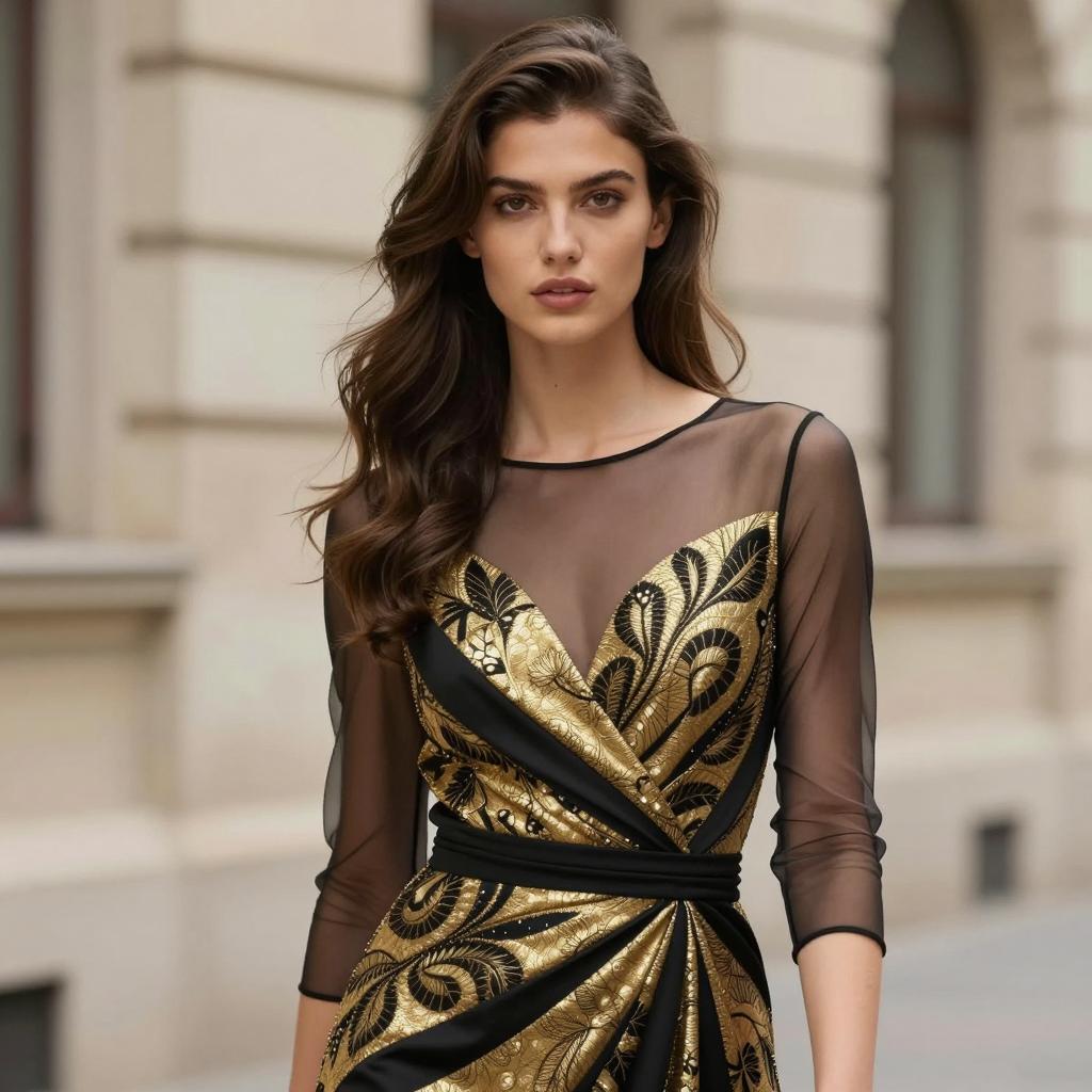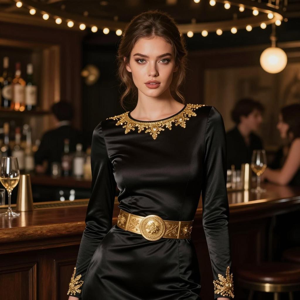 Party wear tops costume, photorealistic, female model, brown hair in updo, black satin long-sleeve dress with gold embellishments on chest and cuffs, gold waist belt with intricate pattern, standing in dimly lit bar, string lights in background, blurred people and bar setup, warm lighting, realistic ures, elegant and stylish, confident expression, medium shot, digital artwork, high detail