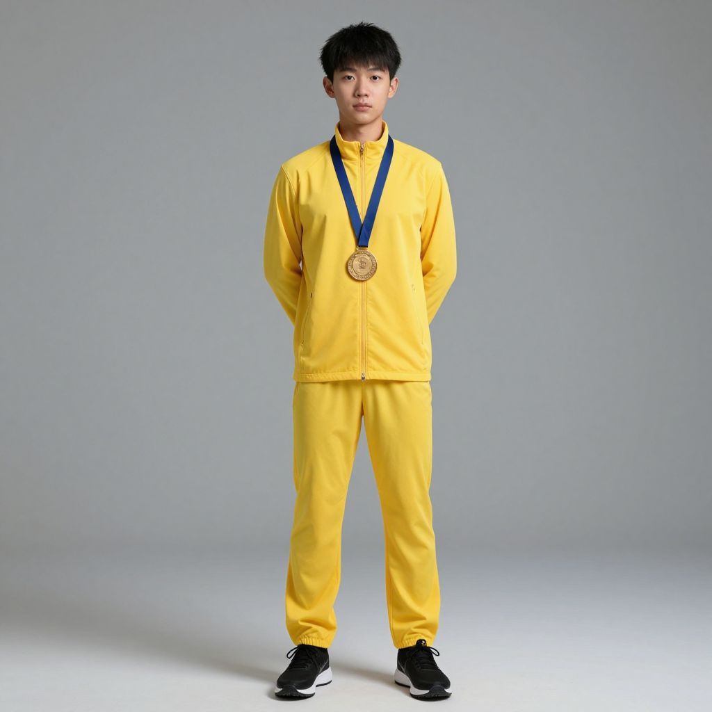 Gold medalist costume, 1boy, male focus, solo, jacket, sneakers, shoes, standing, realistic, full body, black hair, yellow jacket, pants, arms behind back, asian, black footwear
