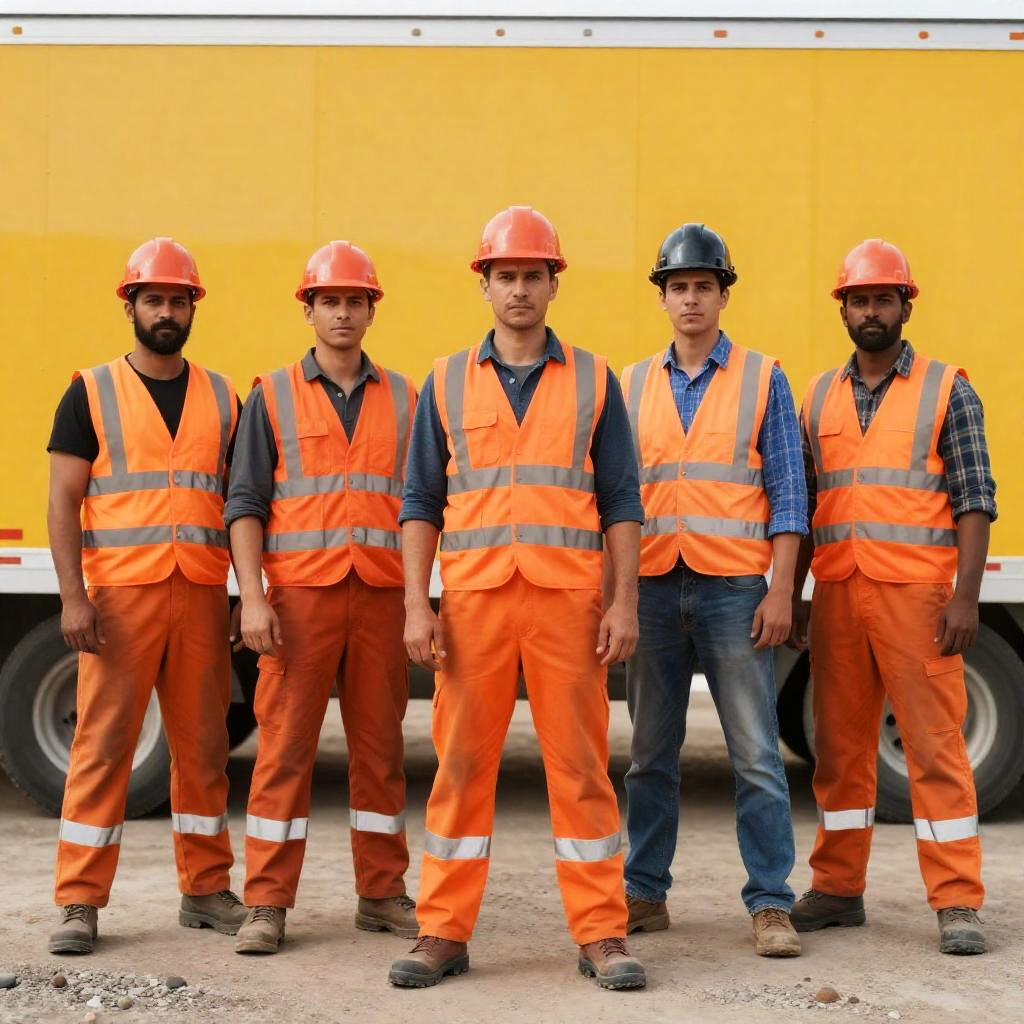 Photograph of five male construction workers standing in front of a yellow trailer. All wear orange high-visibility vests and orange overalls. Three have orange hard hats, one has a black hard hat. One man in a blue plaid shirt and jeans. Gravel ground, serious expressions, casual poses. Four men on left, one in center.
