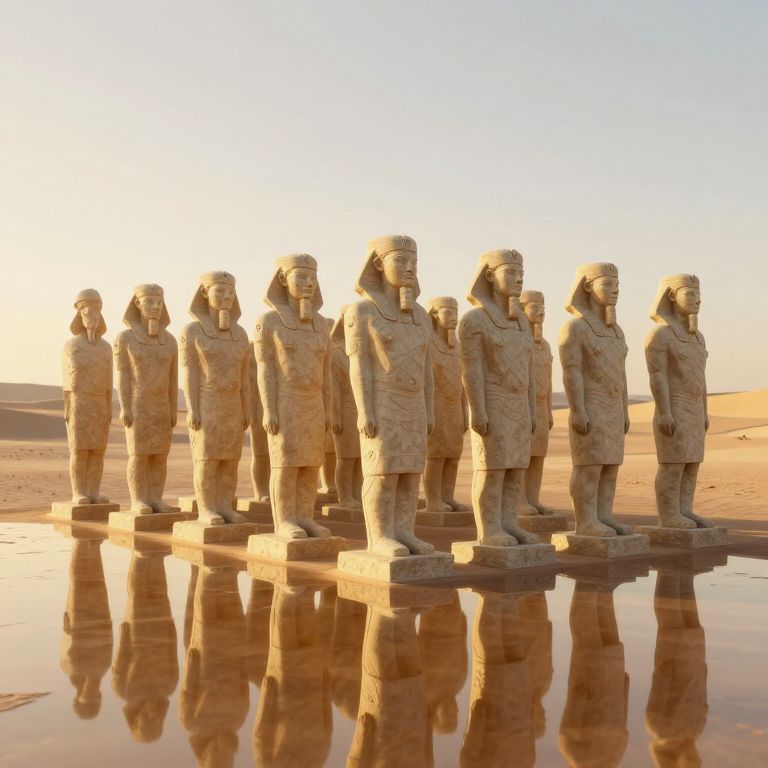 A surreal 3D-rendered tableau depicts a procession of identical stone statues standing in perfect alignment across a shimmering desert landscape, their forms cast in dramatic golden-hour lighting as they dissolve into the mirage-like reflections beneath them.