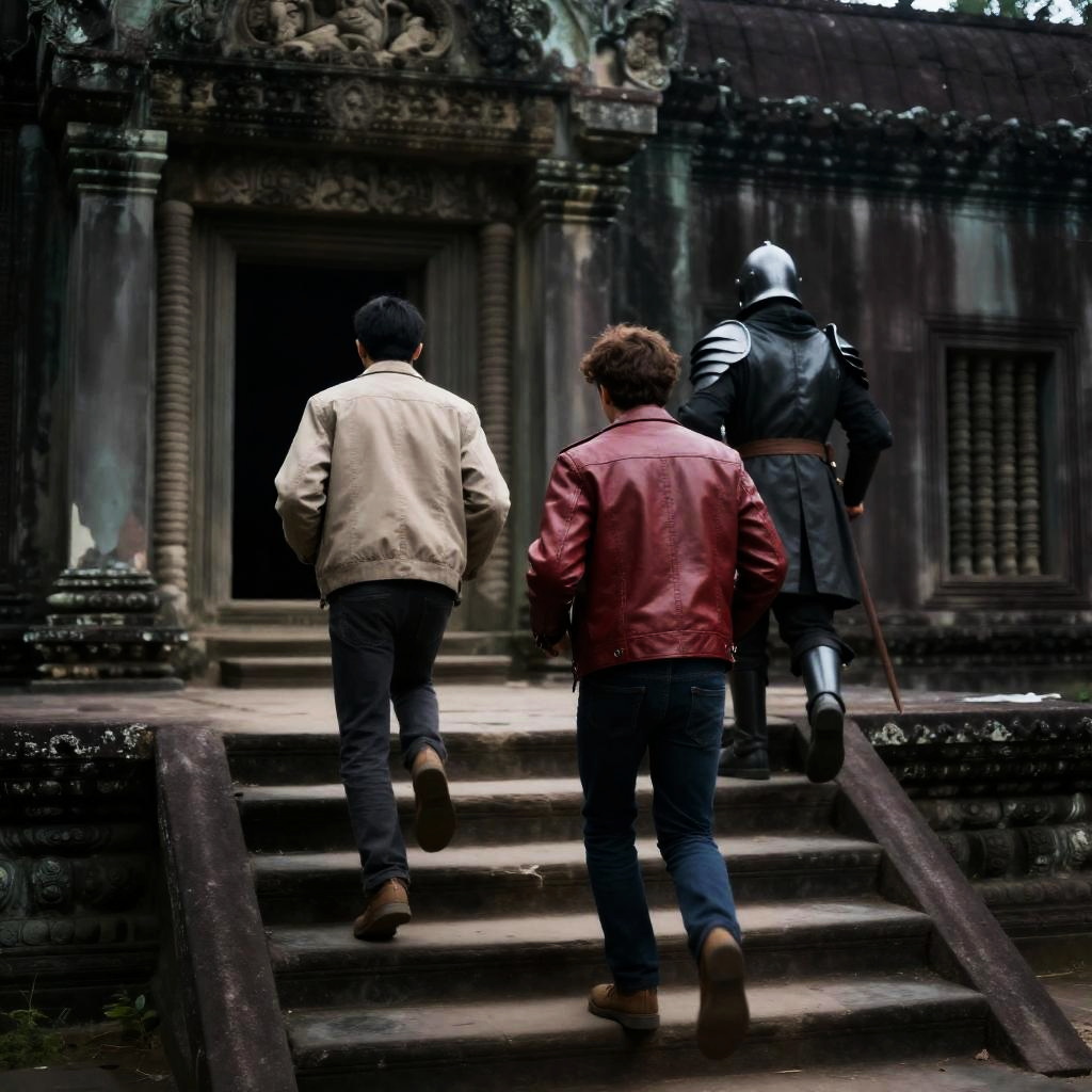 Photograph of a dark, ancient temple with stone architecture. Three people running down a stone staircase. Lead figure in red leather jacket, brown-haired man in beige jacket, and armored figure with helmet in background. Dim, dramatic lighting.