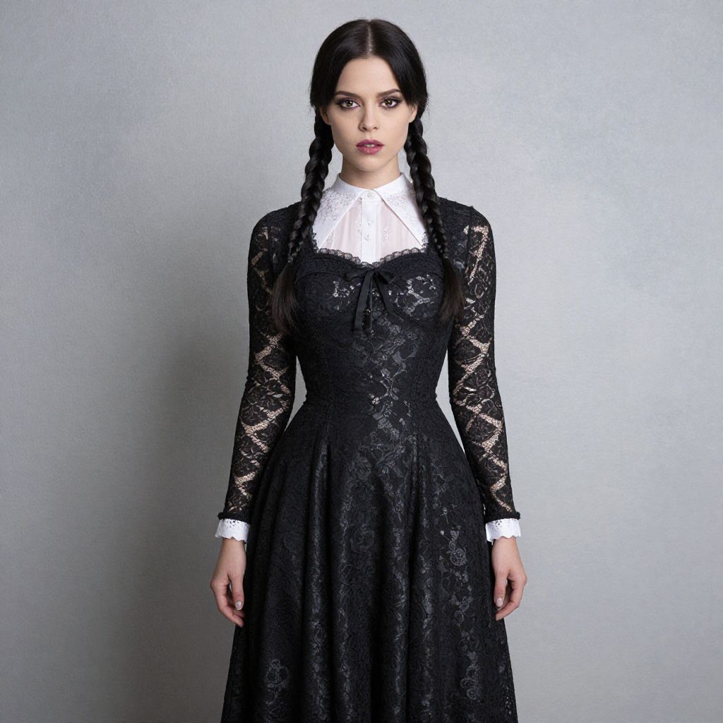 A woman dressed in a full-body cosplay outfit inspired by Wednesday Addams stands confidently against a plain background. She wears a black dress with a white collar and cuffs, complemented by her iconic braided hairstyle, capturing the classic gothic style of the character.