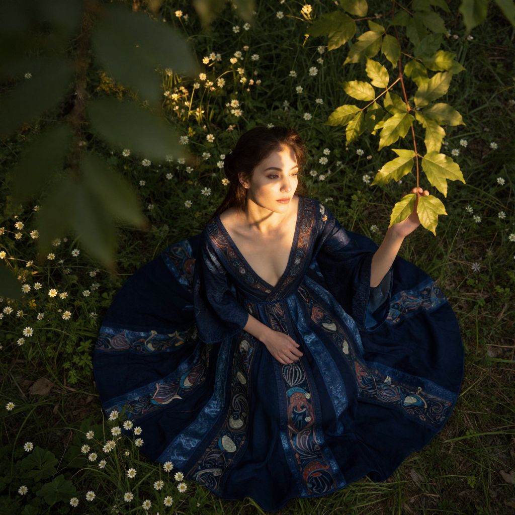 A serene and enigmatic portrait of an Andean woman showcases her ethereal beauty in a flowing midnight blue gown reminiscent of Pre-Raphaelite art. Viewed from above, as if through a magical lens, soft golden sunlight filters through lush green leaves, casting dappled light on her face and the intricate dress patterns. The forest floor blooms with delicate luminescent wildflowers. This captivating image exudes timeless elegance and an enchanting otherworldly aura, inviting viewers to step into a dreamlike portrait that transcends reality.