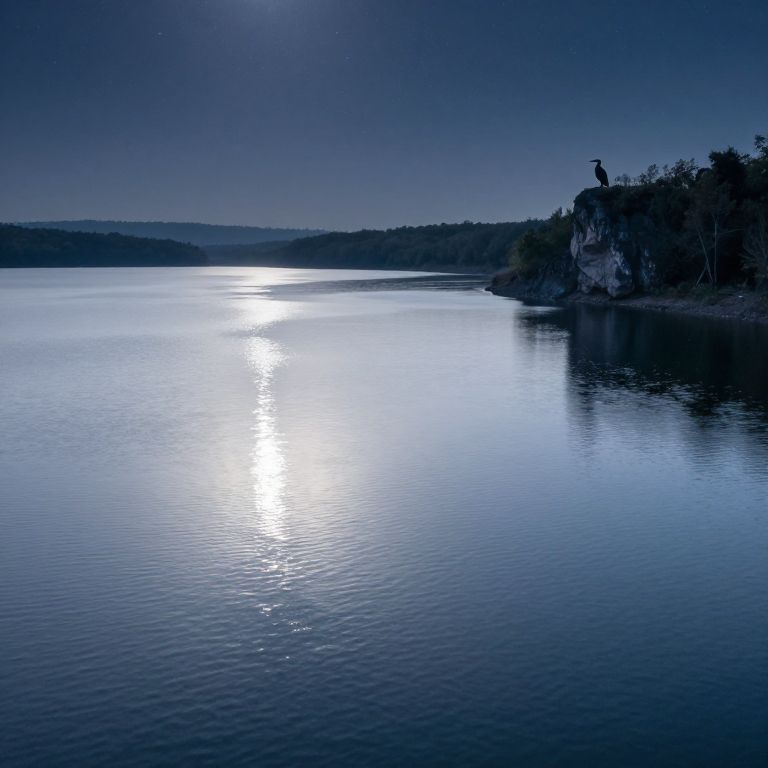 A serene landscape illuminated by soft moonlight showcases an impressionistic style, with gentle ripples on a calm lake reflecting the starry night sky above. From a unique aerial perspective, observe the delicate interplay of light and shadow as it gracefully dances across the silvery surface, while a majestic bird perched atop a distant cliff watches over the scene with piercing intensity, creating a harmonious blend of nature and solitude that evokes both wonder and peace in equal measure.