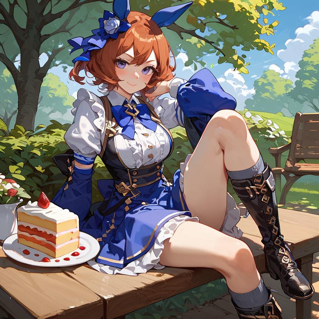 [score_9, score_8_up, score_7_up], source_anime, 1girl, solo, mejiro mcqueen \(umamusume\), idol costume, green kneehighs, black boots, sitting, table, plate, cake, smile, blush, park, outdoors