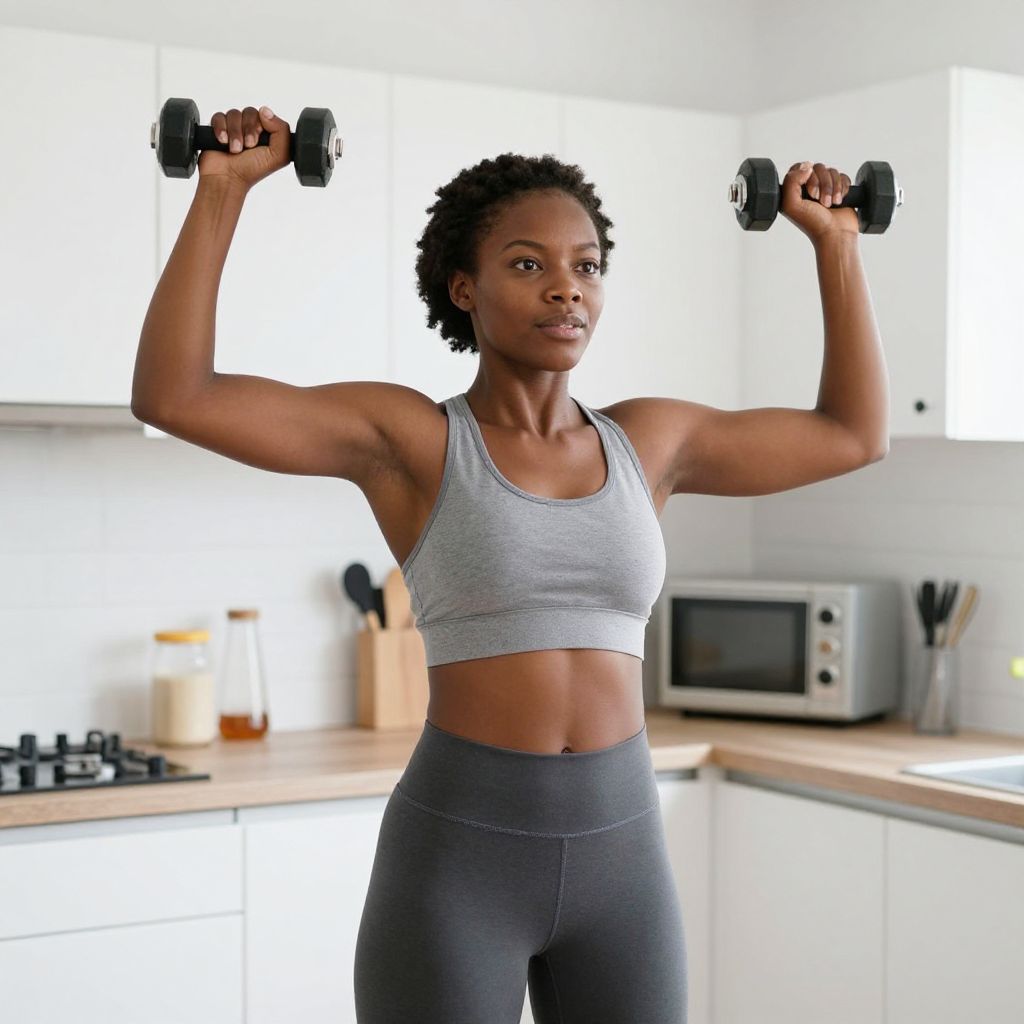 Black woman in kitchen exercising with weights to build a strong immune system