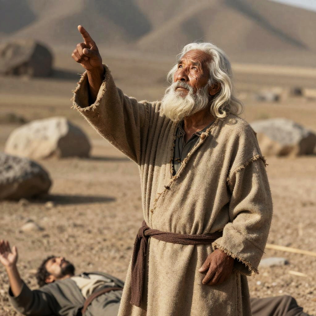 Old man with long white hair and beard, wearing a rough woolen robe, points upward. Background: barren, rocky landscape. Another person, lying on ground with arm outstretched, visible in foreground. Sunlight highlights man's robe and facial features.