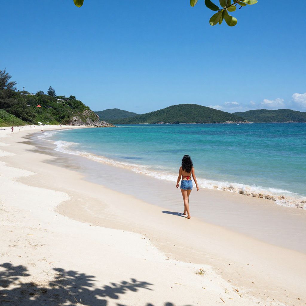 Woman strolling along Los Frailes Beach, her silhouette framed by pristine white sand, vibrant turquoise waters, and distant green hills under a clear blue sky.